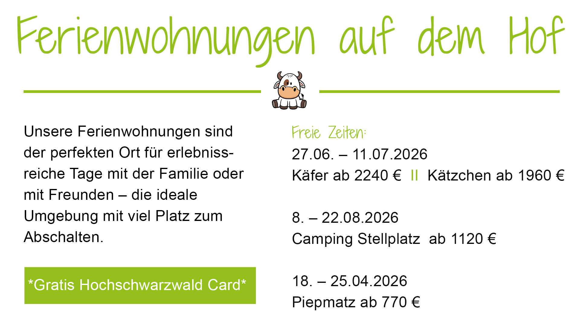 | 13.bis 27.Juni 2026 | Ferienwohnung Kuhglocke *14 Tage* | ab 2170 Euro |